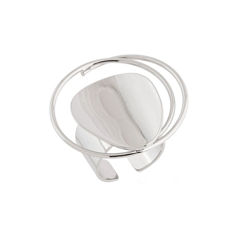 Este anel apresenta um design moderno e elegante, com um aro largo e ajustável. O destaque da peça é um elemento central assimétrico e orgânico, com superfície lisa e polida, criando um ponto focal contemporâneo. Duas hastes finas e curvas emergem do aro, envolvendo parcialmente o elemento central e adicionando um toque artístico ao design. O aro é aberto na parte inferior, tornando-o ajustável. É uma semijoia sofisticada e com personalidade, ideal para adicionar um toque de estilo e modernidade ao visual.