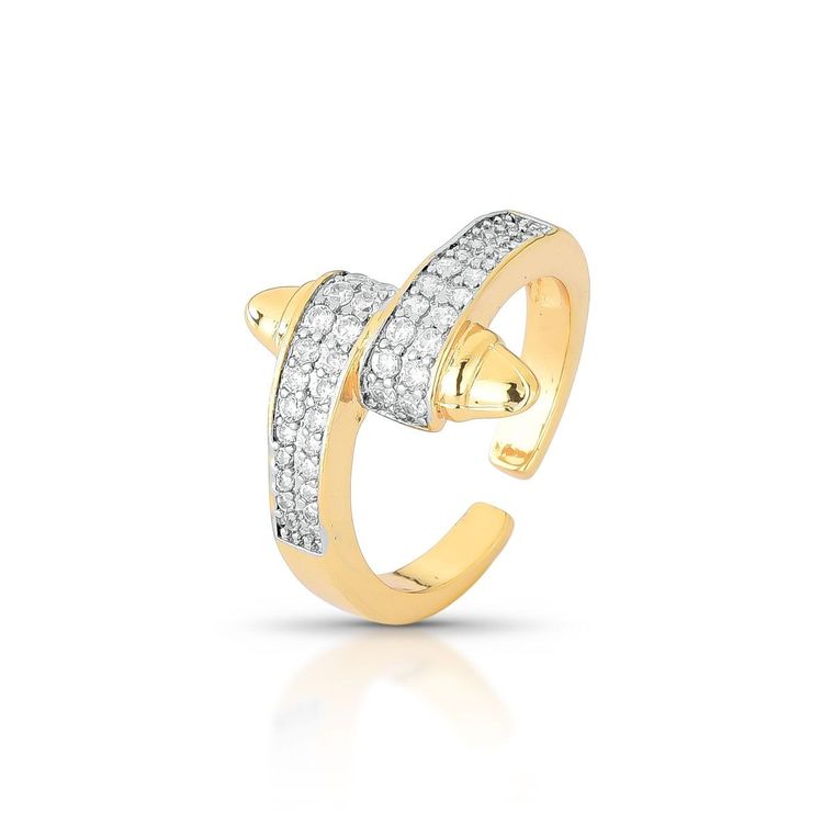 Este anel ajustável apresenta um design moderno e impactante, com um formato que lembra uma estrutura única e pontiaguda, um "one spike" estilizado. A peça é predominantemente em banho dourado, com acabamento liso e polido. A parte central do design apresenta uma faixa curva densamente cravejada com pequenas zircônias cristais, cujo brilho é realçado pelo acabamento em ródio branco, criando um contraste luminoso com o dourado. Nas extremidades dessa faixa cravejada, há detalhes volumosos e arredondados em banho dourado, que emolduram a parte central e reforçam a estética singular da peça. O aro do anel possui uma abertura na parte inferior, o que o torna ajustável. É uma semijoia contemporânea e impactante, ideal para adicionar um toque de ousadia e originalidade ao look.