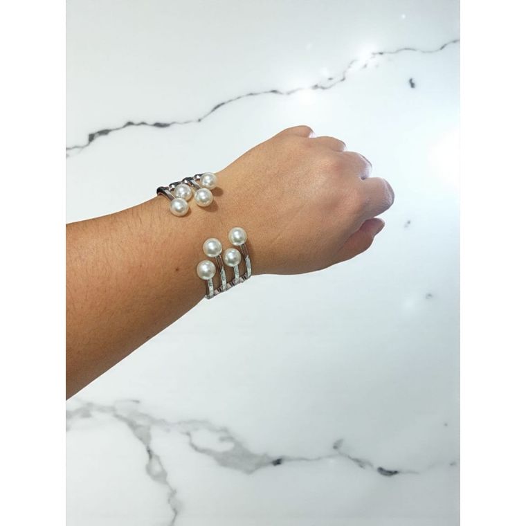 Bracelete com estrutura rígida em metal polido, 4 garras com aplicação de pérolas em dupla composição. O contraste entre o brilho metálico e o toque acetinado das pérolas cria um visual moderno e sofisticado.