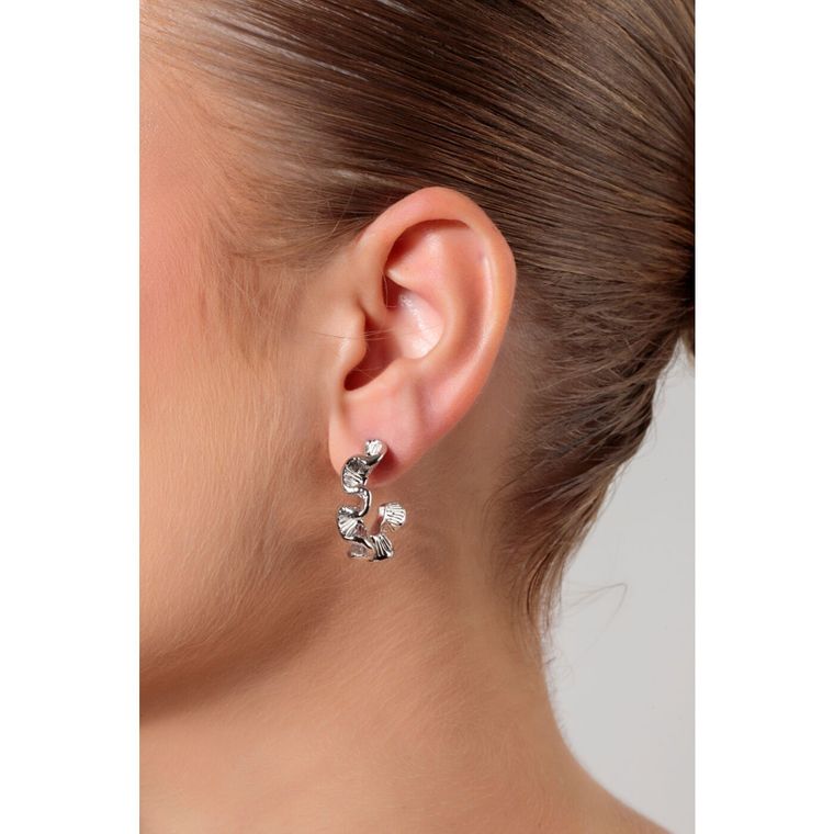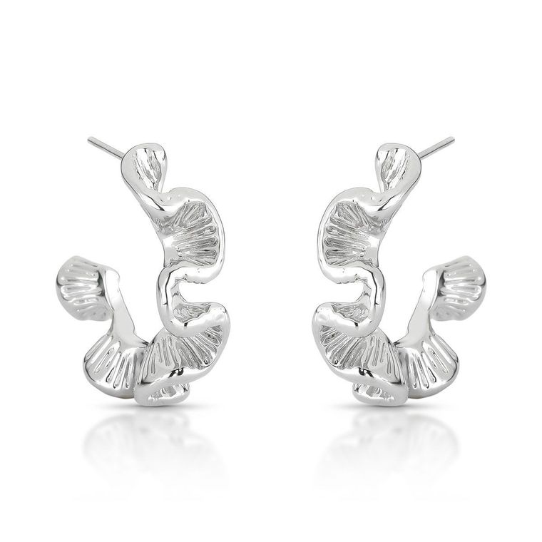 Acabamento em Ródio Branco: Toda a estrutura do brinco possui um elegante banho de ródio branco. Este acabamento confere à peça um brilho prateado intenso e duradouro, assemelhando-se à platina e realçando cada curva e textura do design orgânico.
