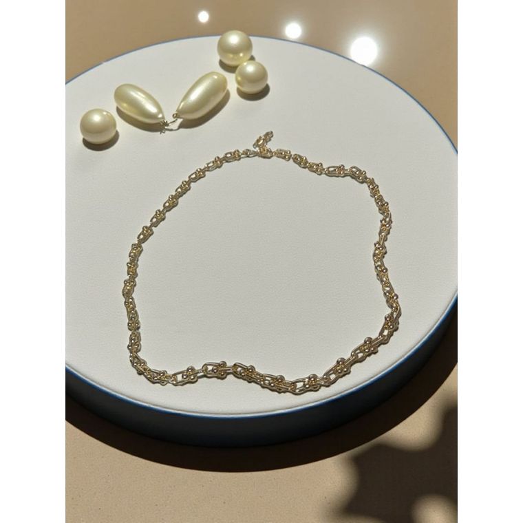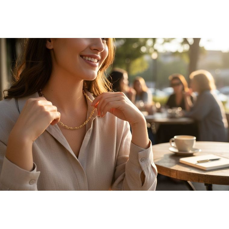Um colar de elos delicados com microesferas entrelaçadas, criando volume sutil e brilho elegante. Versátil, eleva do look básico ao sofisticado sem pesar. Acabamento dourado com fecho de lagosta e ajuste de comprimento para usar mais curto (efeito choker) ou clássico.