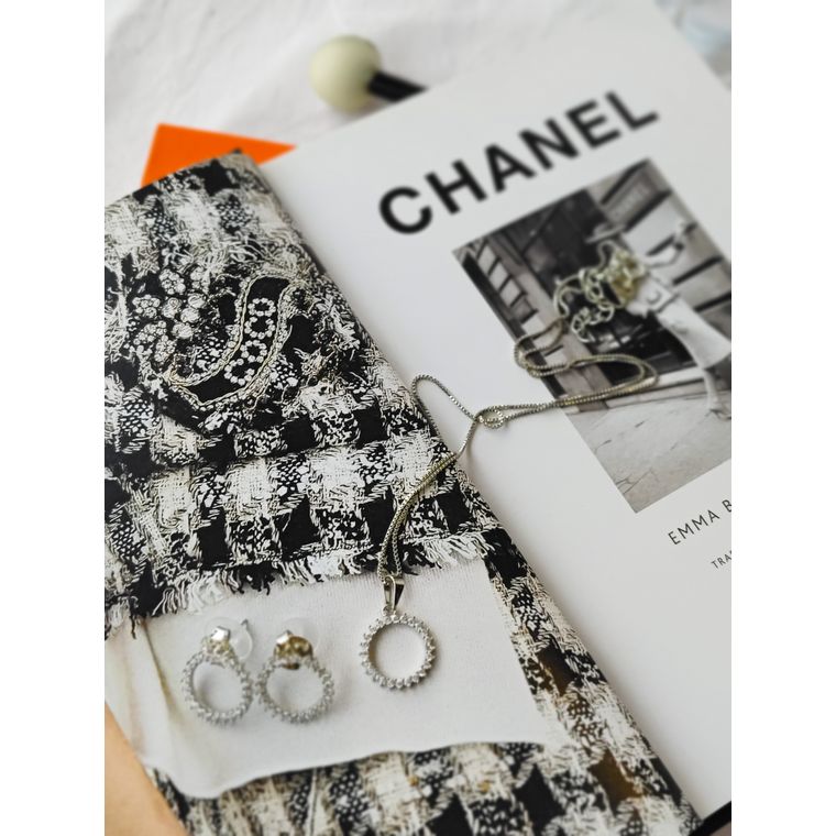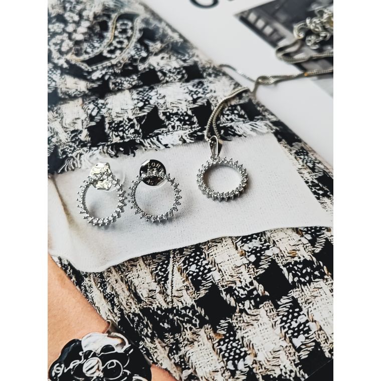 O Conjunto Circle Cravejado Prateado é a interpretação moderna e sofisticada do clássico halo de brilho. Com acabamento em ródio branco e zircônias cristal lapidadas, ele ilumina qualquer produção com elegância minimalista e atemporal.